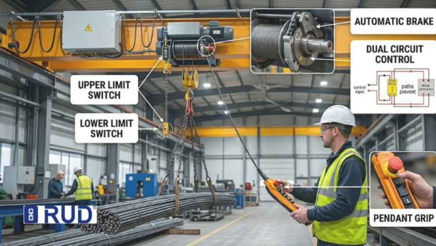 • Upper and Lower Limit Switches: Travel limits stop movement before chains run out or loads hit overhead structures, which helps prevent equipment damage and worker injuries.